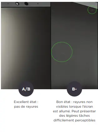 Écran : bon état. Rayures non visibles lorsque l’écran est allumé. Peut présenter des légères tâches difficilement perceptibles.
